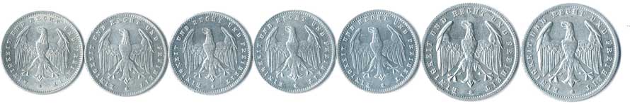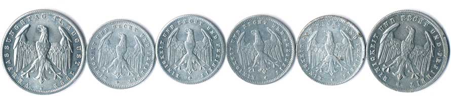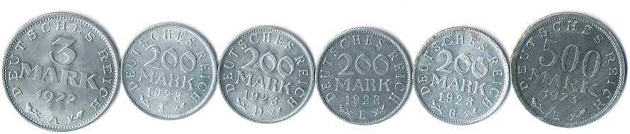 | 731. | 3 Mk. 1922 A, 200 Mk.1923 A,D,E,G, 500 Mk.1923E, n.kor., 6ks | 0-1 | 90,- | 90,- |