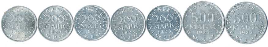 | 732. | 200 Mk.1923 A,D,E,F,J, 500 Mk.1923A,F, 7ks | 0-1 | 140,- | 140,- |