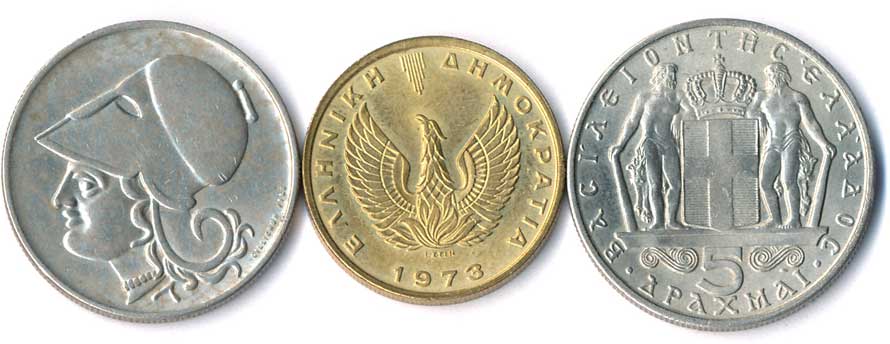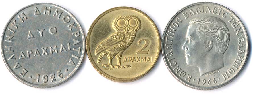 949. 2 Drachma 1926, Athéna, 1973, sova, 5 Drachma 1966, Constantin II., 3ks 0/0 50,- 50,-