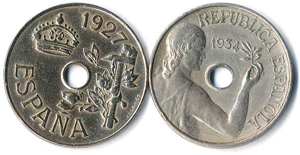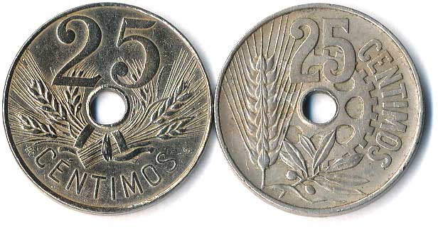 963. 25 Centimos 1927 S, Julio Segura Calvé, 1934, Republika se snítkou vavřínu, 2ks 1/1 50,- --.-