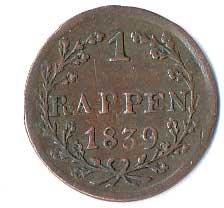 973. 1 Rappen 1839, ražba bez oddělovacího kruhu kolem opisu a věnce (Av,Rv) 1/1 200,- 200,-