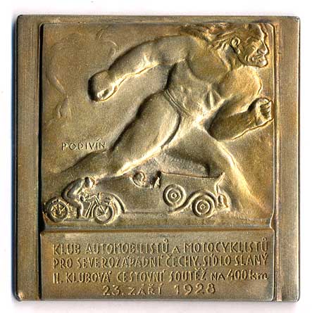 soutěž na 400 km, alegorie větru, automobilu a motocyklu, zlac.Ag? 46x46/52g, hrana, původní poškozená etue AMK Slaný |