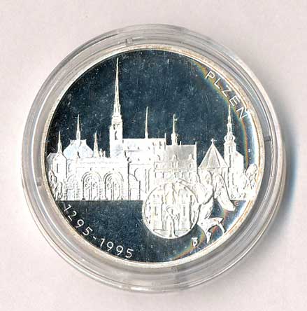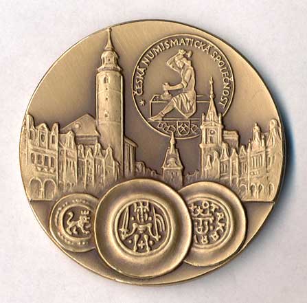 znak města, datace, opis / mince, budovy na náměstí, znak ČNS, Br50, etue, certifikát (Harcuba J.), raženo 25ks |