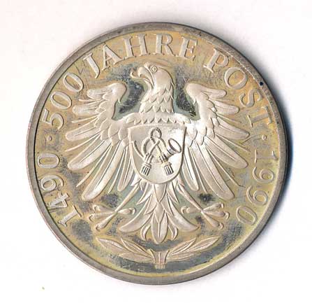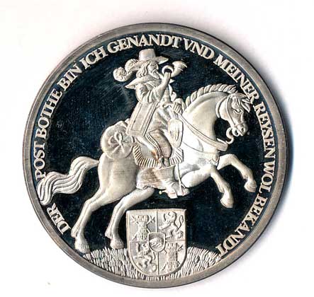 | 1571. | 500 let pošty 1490-1990-jezdec s trubkou na koni ve skoku nad erbem, opis / erb