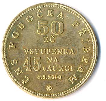 | 1599. | ČNS Příbram-50kč vstupenka na 45.aukci 4.3.2000-čtyřřád.náp.,číslice, datace, opis /