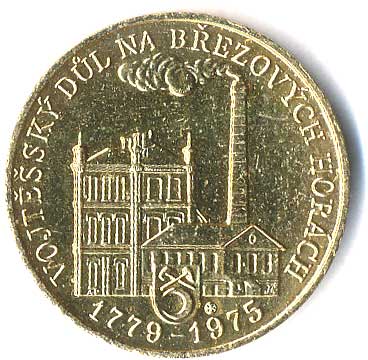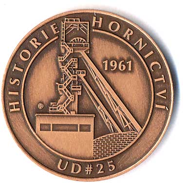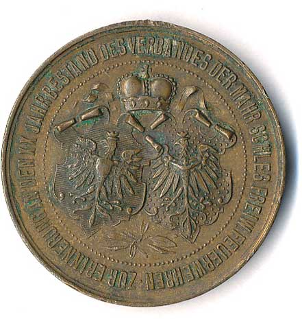 přilba, sekyry, žebřík, lano, datace, něm.opis / orlice v erbech, nad nimi koruna, něm. opis, Cu36, hry. |