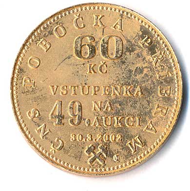 | 1603. | ČNS Příbram-60kč vstupenka na 49.aukci 20.3.2002-čtyřřád.náp.,číslice, datace, opis /