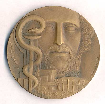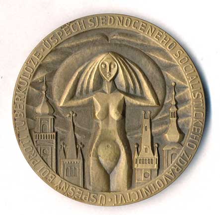 stylizovaný lékařský motiv, had s miskou, lipový list, hvězda, plíce, opis / žena čelně, historické budovy, opis, sign. Hvozdenský, Br60, etue |