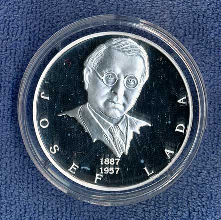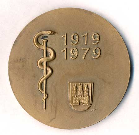 nemocnice - areál budov, datace, ratolest, opis / Aeskulapova hůl, v pozadí pamětihodnosti, opis, sign.JH-MP, stříbř.Br74, etue |