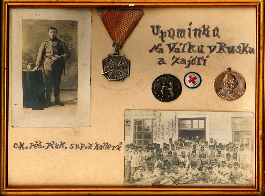 a zajetí" a "C.K.pěš.pluk sv.P.z Kollerů, fotografie vojáka, fotografie pluku, fotografie vojáka, Karlův kříž, medaile SIGNUM MEMORIAE, odznak červeý kříž, zřejmě odlitek čepicového odznaku GRUPPE FMLTv.HADFY 1915-1917, neurčeno, rámeček |