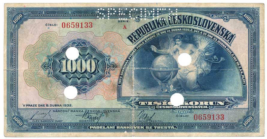 | 2020. | 1000 Kč 1932, s.A, SPECIMEN, 4x skartační otvor 10mm | 3- | 1500,- | --.- |