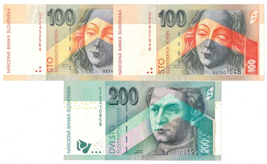 | 2110. | 100 Sk 2001, s.U (2x dírka), 100 Sk 2004, s.U, 200 Sk 2006, s.E, 3ks | 1-2 | 800,- | --.- |