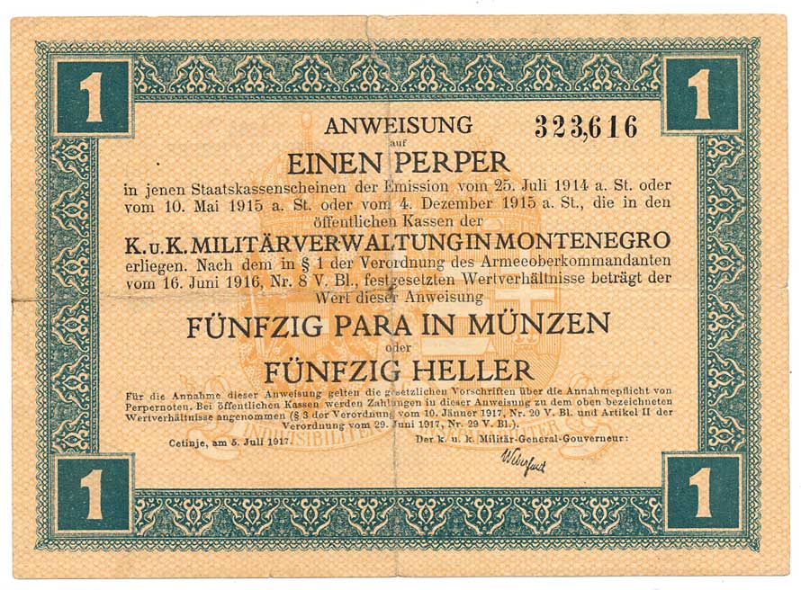 | 2116. | 1 Perper 5. července 1917, Rakousko-uherská okupace, natržený | 2-3 | 100,- | --.- |