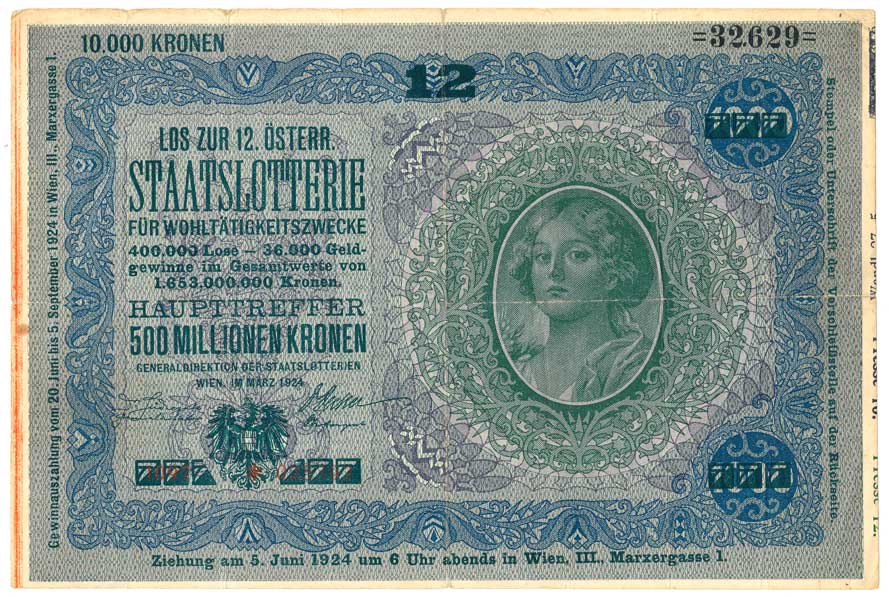 12.Státní loterie 1924, na Rv.kulaté nečitelné razítko Vídeň |