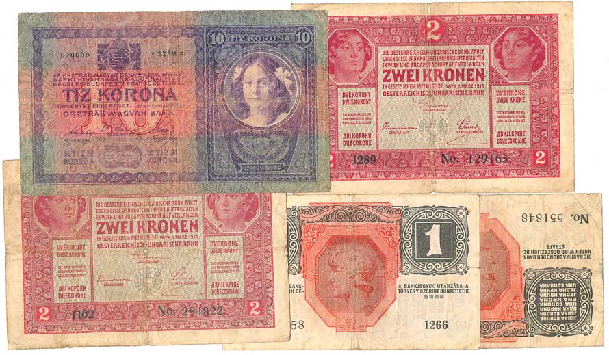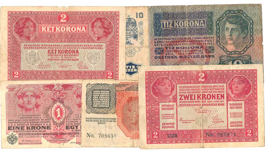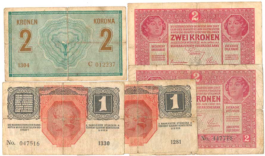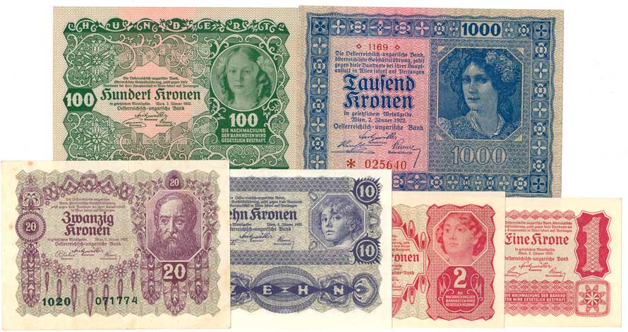 | 2123. | 1,2,10,100,1000 Kronen 1922 (N), 20 Kronen 1922 (1, skvrnky), 6ks | - | 80,- | --.- |