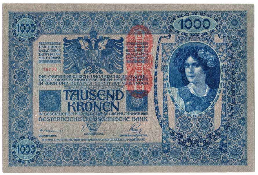 | 2124. | 1000 Kronen 1902, s.1470, svislý přetisk Deutschösterreich | N | 150,- | --.- |