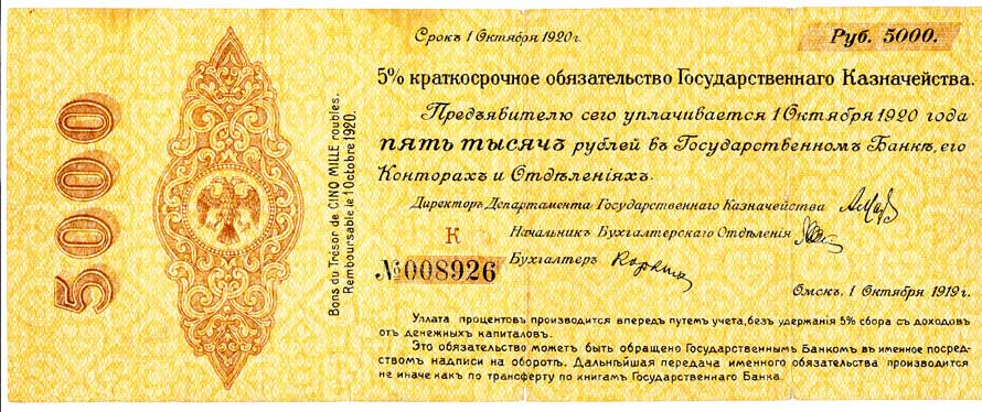| 2130. | 5000 Rublů 1.10.1919, Prozatímní vláda Na Sibiři - Omsk, 315x120 mm,