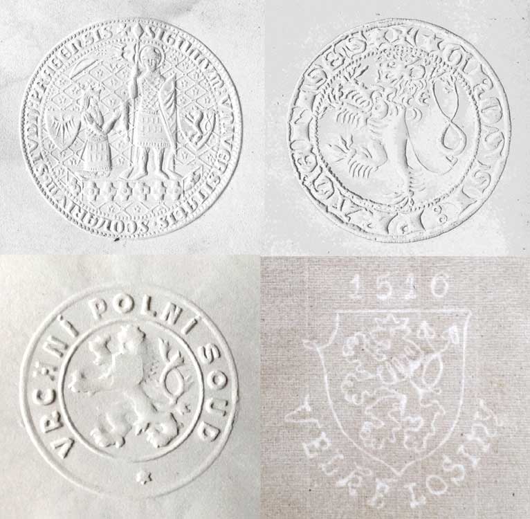 pražský groš, průměr 8cm, na papíru 20x21cm, VRCHNÍ POLNÍ SOUD, průměr 3,6cm, na papíru 10x15cm + Velké Losiny, vodoznak 10x11cm, na ručním žilkovaném papíru 17x22cm (všechny skeny jen výřezy) |